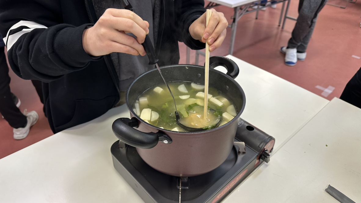 自分たちで収穫した「大根」と「青梗菜」を使ってお味噌汁作りに挑戦! 丁寧に洗い、包丁で切り、分量を測って……。 一から自分たちで作ったお味噌汁は、お出汁の香りと採れたて野菜の甘みが合わさって最高の味でした😋