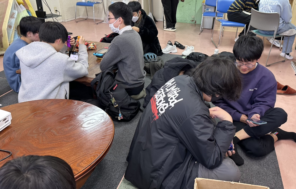 「ちゃぶ台」を囲むアットホームな空間でみんなでゲーム! 初代ファミコンの『マリオ』から最新作まで、それぞれに持ち寄った好きなゲームを楽しみました。 他にもマインクラフトやスプラトゥーンで盛り上がったり、ゲームを通じて仲が深まる時間になりました👾